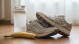 ランニング直後の疲労した手を写し、プロテインシェーカーとバナナを持つランナーの手元の実写写真。
